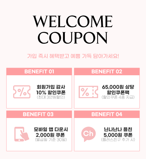 닌나난나에서는 모든 상품이 무료배송! 회원가입시 월간 쿠폰팩 제공 그외에도 혜택이 팡팡!!