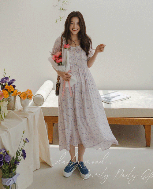[리본끈SET]크레페 잔꽃 체크 퍼프 스퀘어 롱원피스 [Free(55~77)]