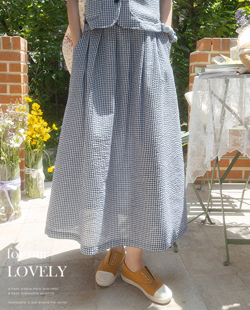 [셋업가능]밀러 뒷밴딩 핀턱 A라인 체크 시어서커 롱스커트 [Free(55~66)]
