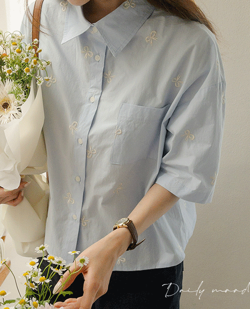 오프니 리본 자수 카라 반팔셔츠 [Free(55~66)]