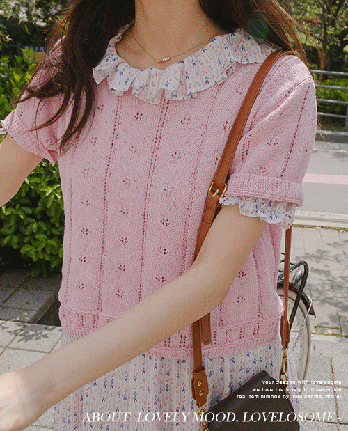 데이지 엠보 배색레이스 퍼프 반팔니트 [Free(55~66)]