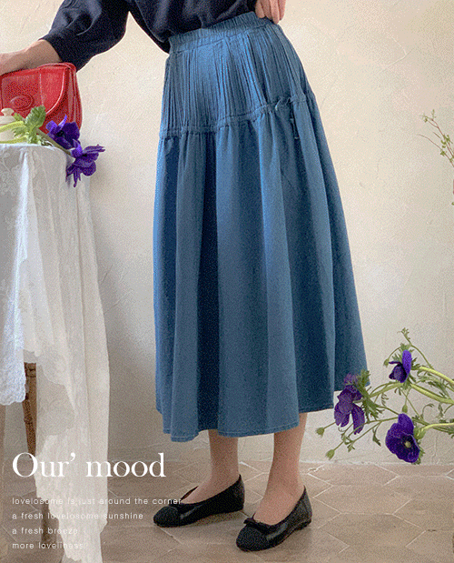 [4계절 가능] 멜로디 리본 셔링 데님 스커트[Free(55~77)]