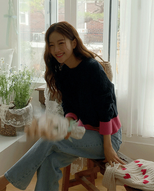 리브 케이블 배색 니트 [Free(55~66)]