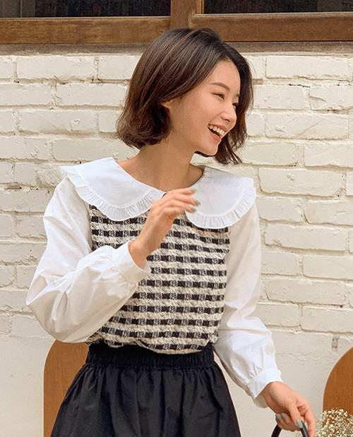 엠마 셔링 빅카라 체크배색 블라우스 [Free(55~66)]
