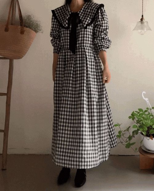프린츠 리본 루즈핏 빅카라 체크원피스 [Free(55~66)]