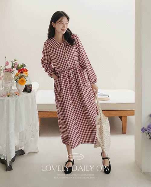 블랑쉬 라운드 카라 체크 롱원피스 [Free(55~77)]