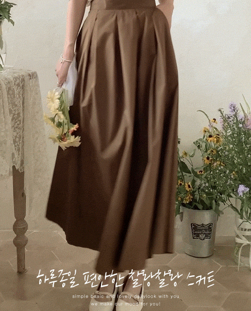 포엘 뒷밴딩 핀턱 플레어 롱스커트 [Free(55~66)]