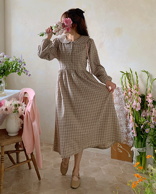 블랑쉬 라운드 카라 체크 롱원피스 [Free(55~77)]