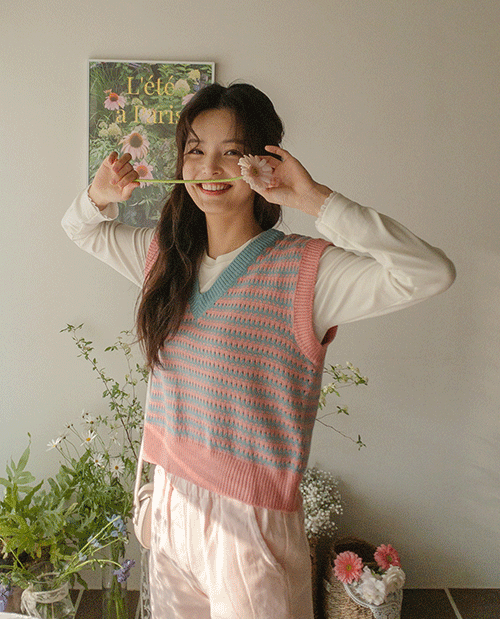 에띠듀 파스텔 배색 스트라이프 베스트 [Free(55~66)]