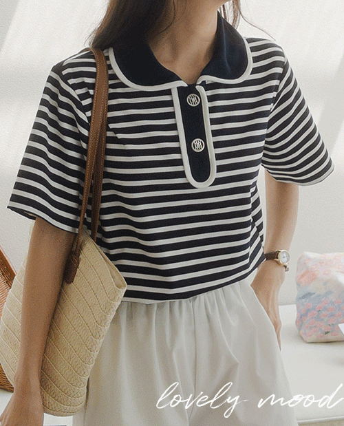 [쿨한 소재감이 매력적인 티셔츠][단가라 디자인][둥근 라운드넥 디테일로 발랄하게~][프론트 은장버튼은 고급스러움을 더해줘요!]
