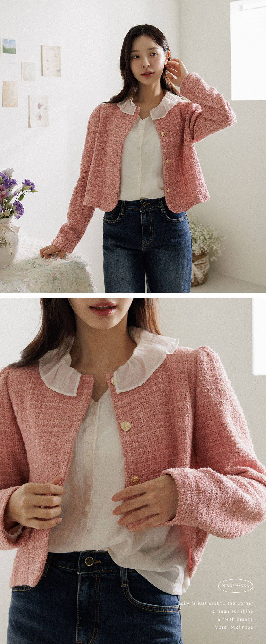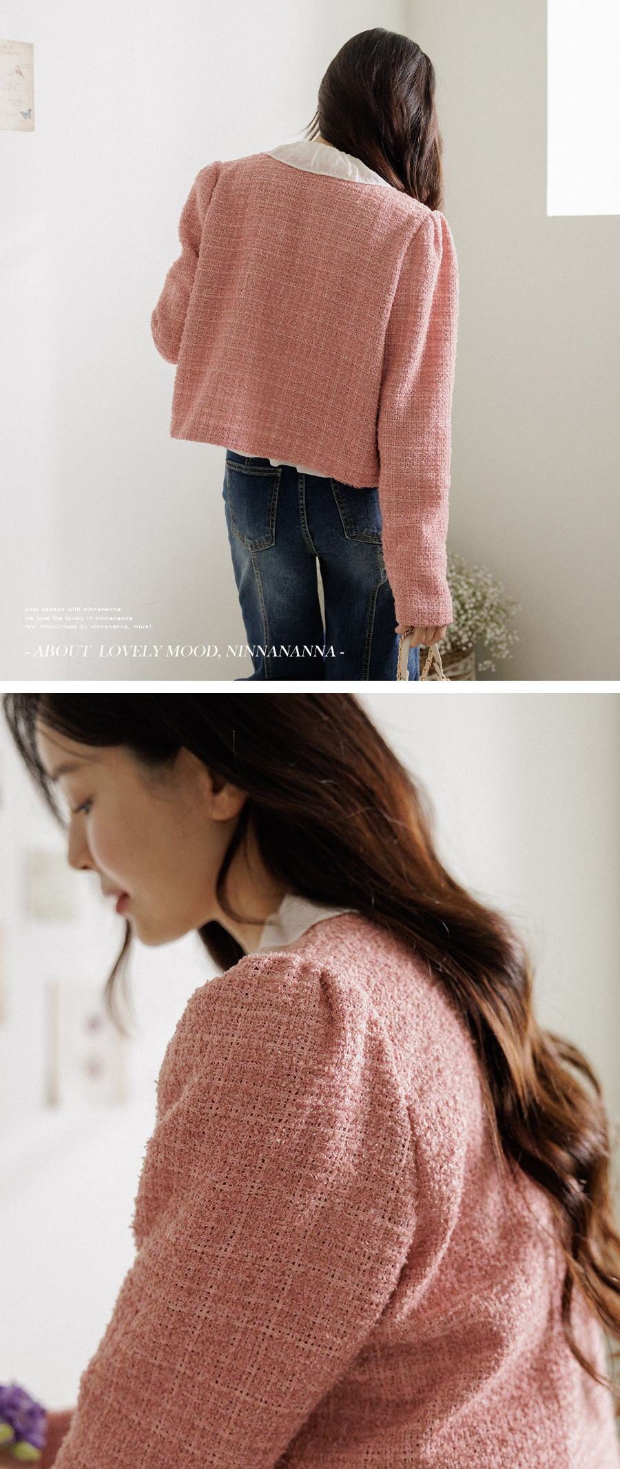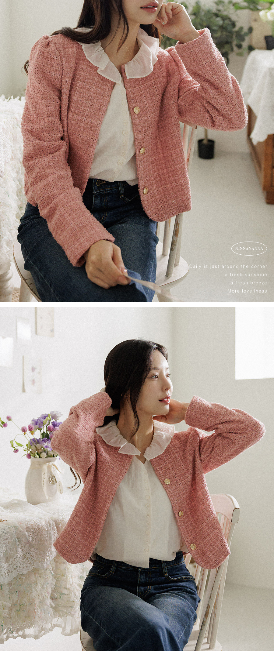 동시에 잡아주는 트위드 자켓이에요.