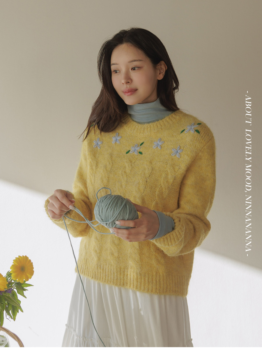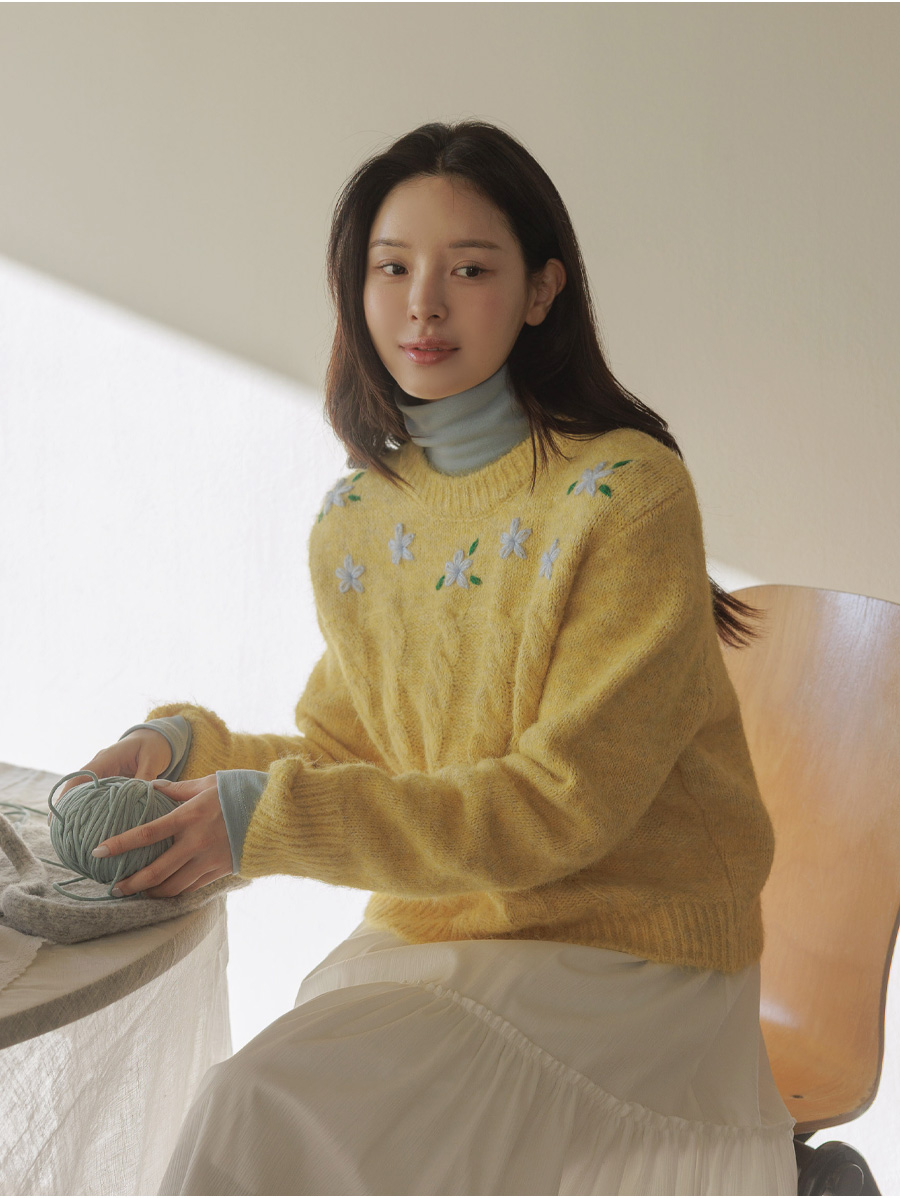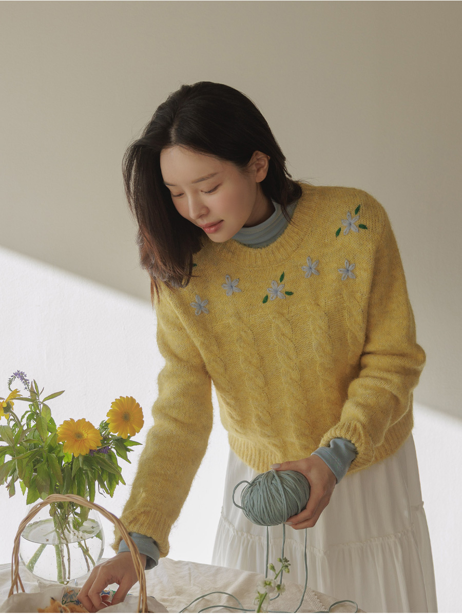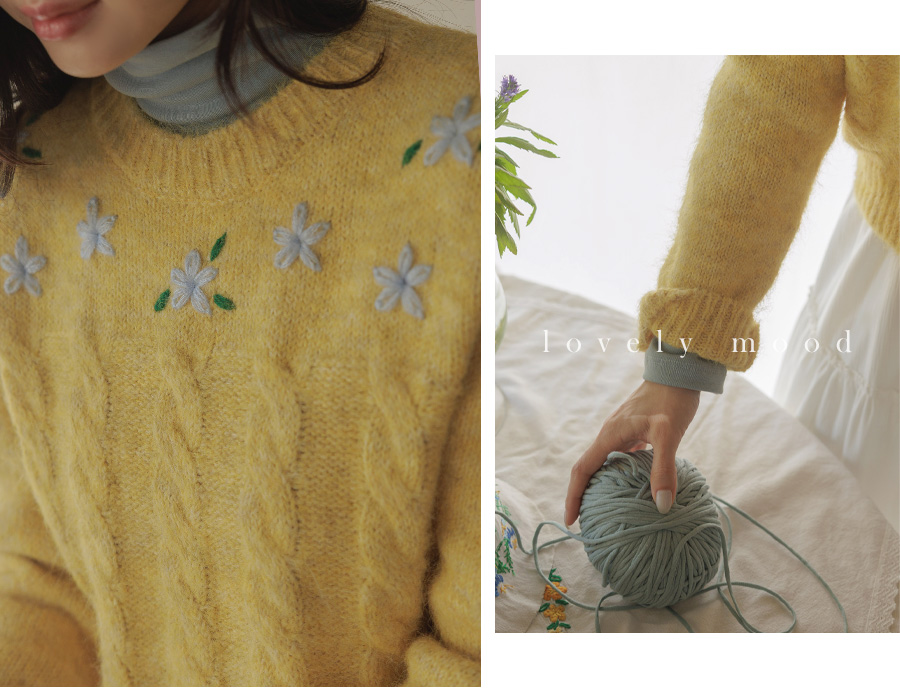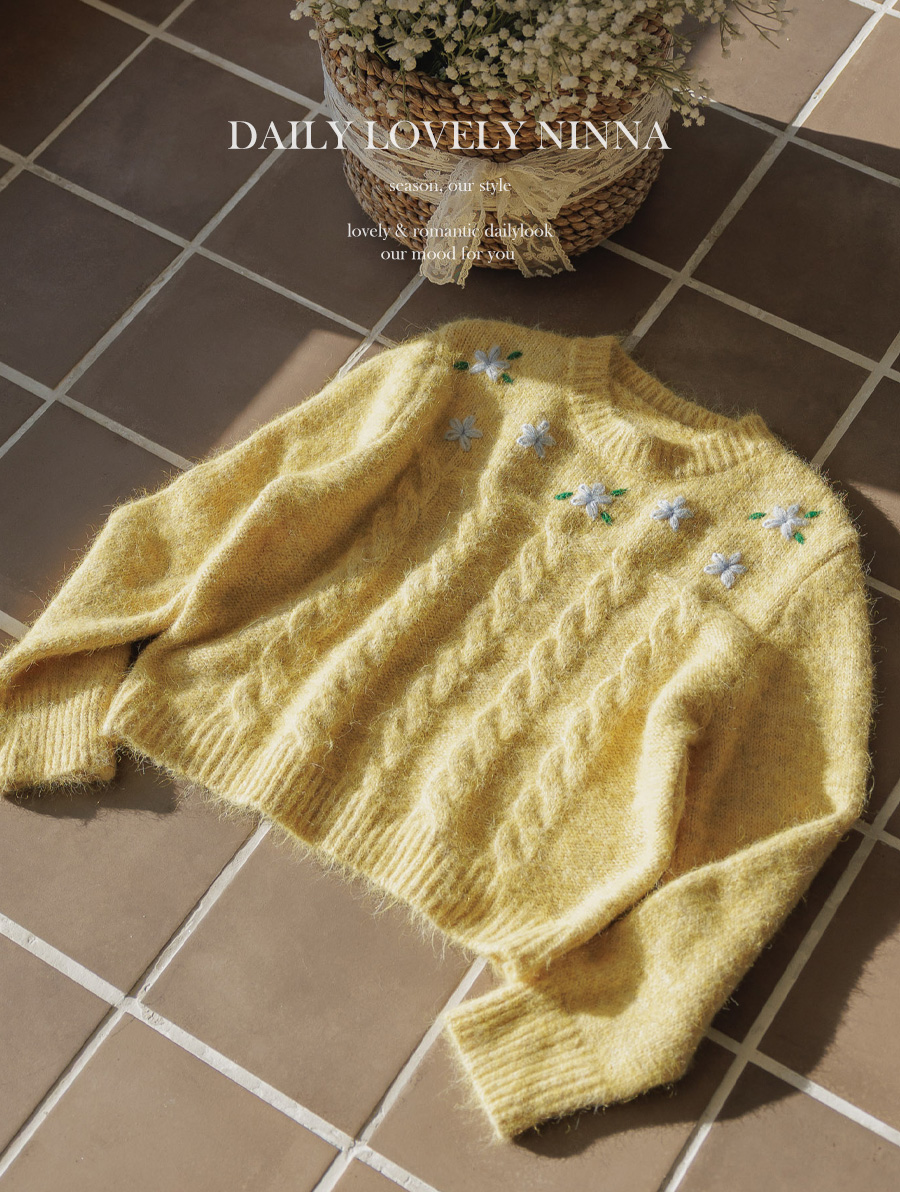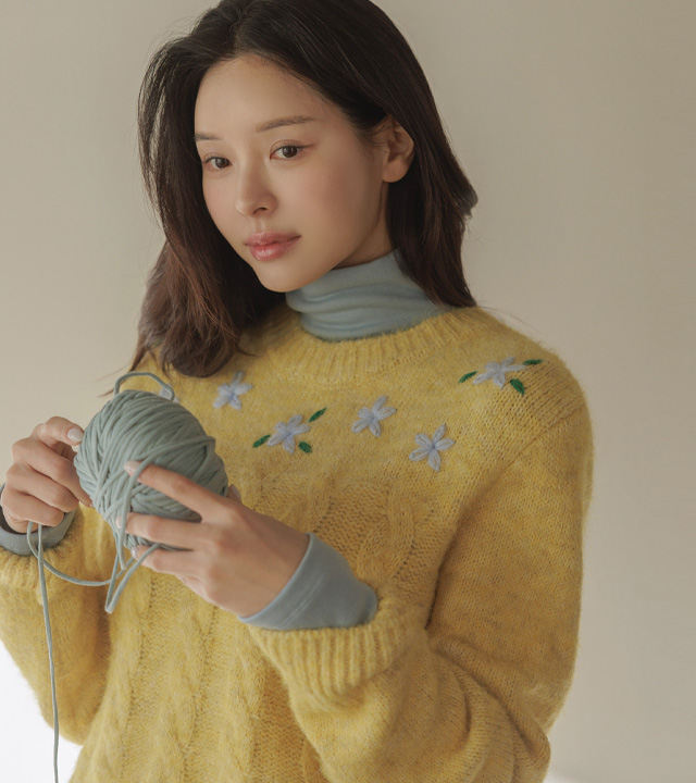 포근한 헤어리 꽈배기 니트에 자수가 은은히 더해져 겨울 내내 사랑스럽게:)