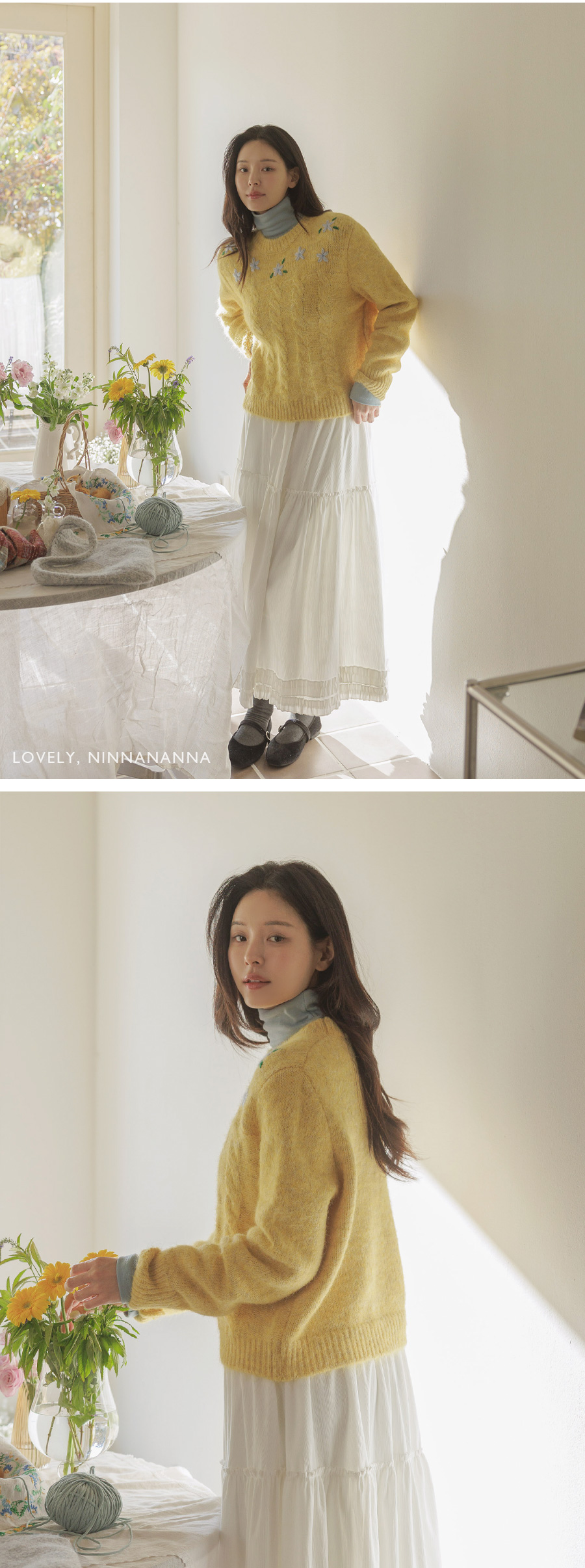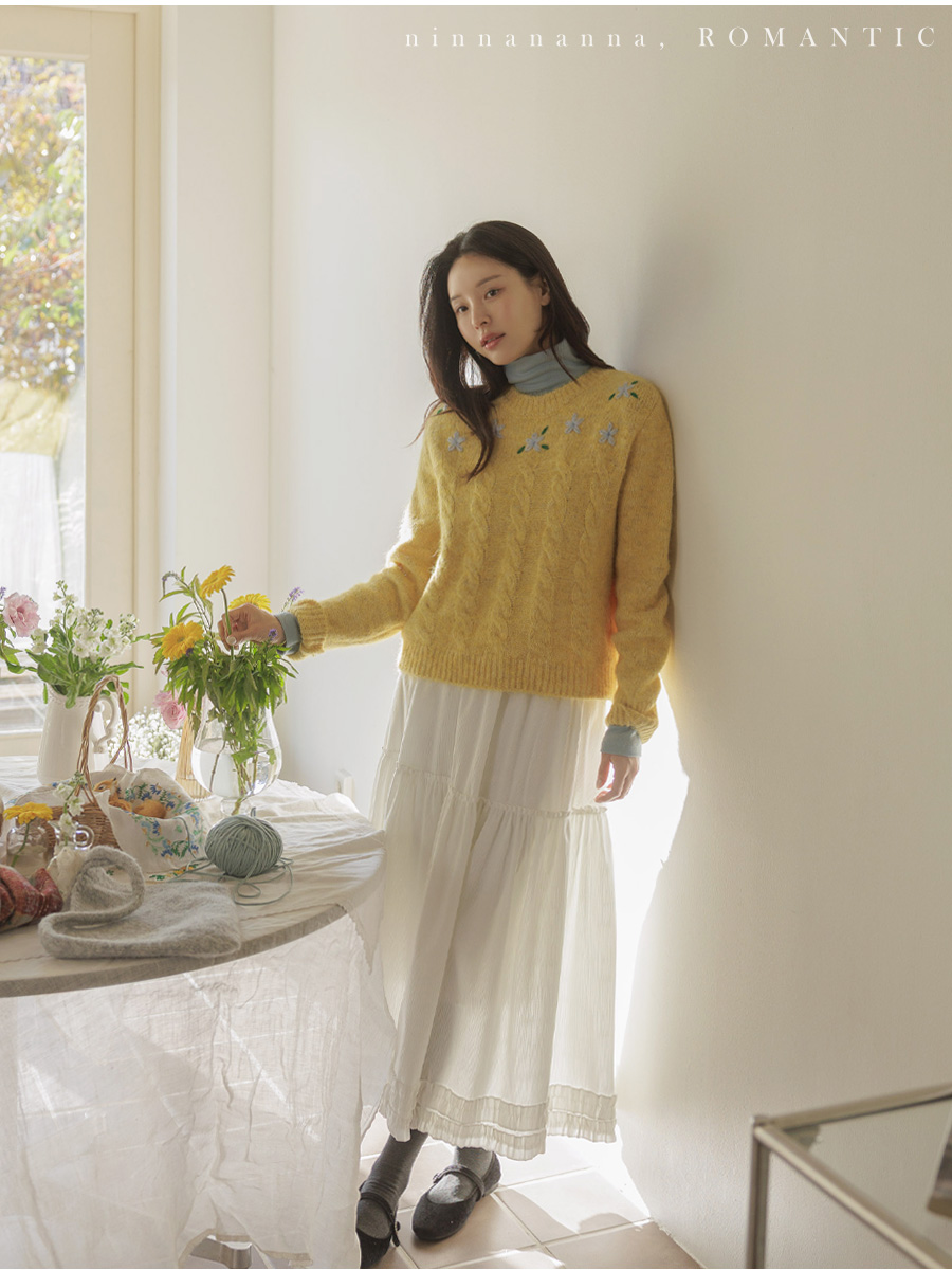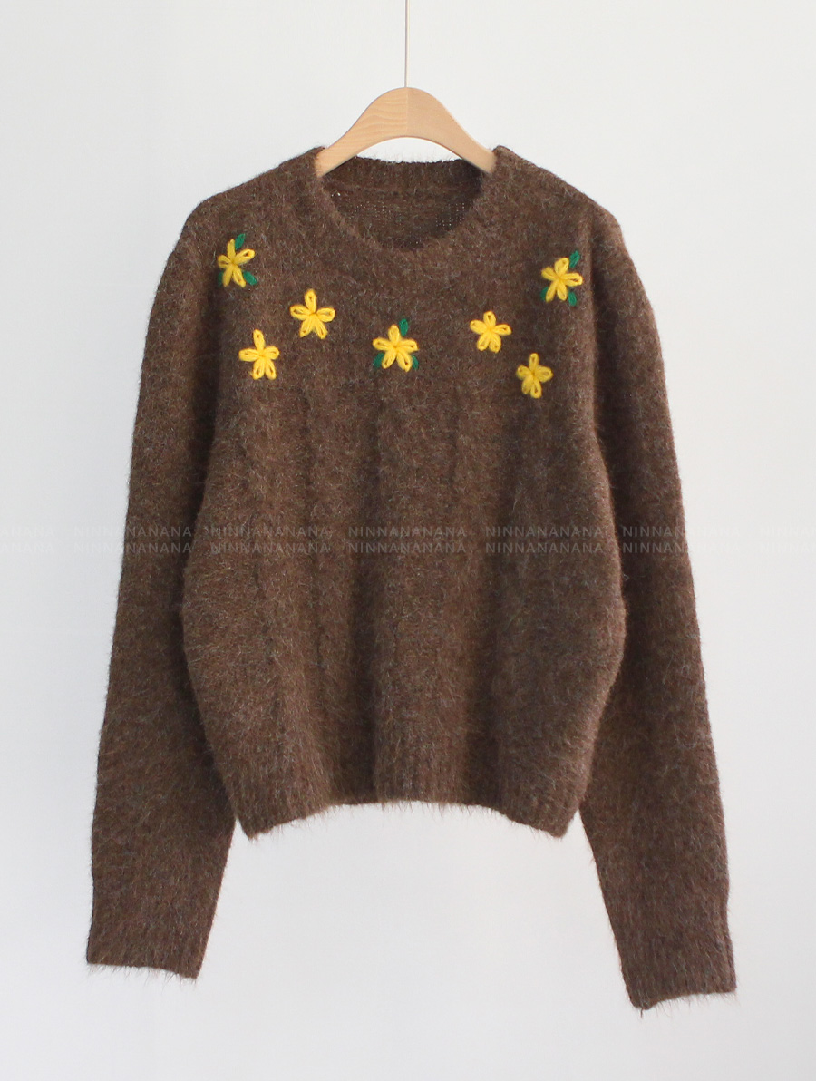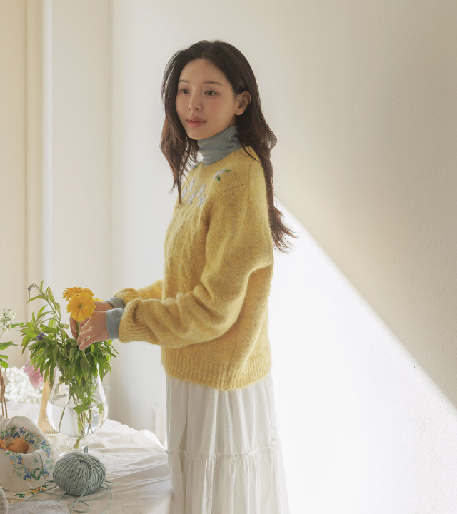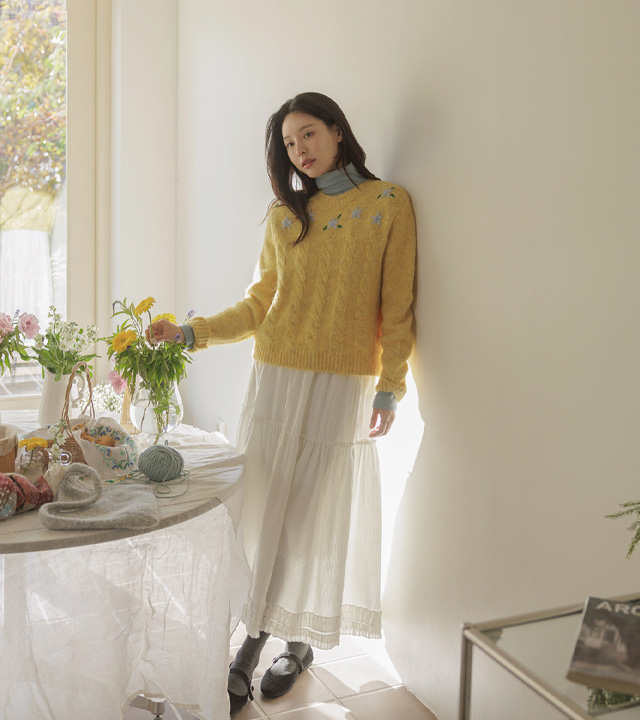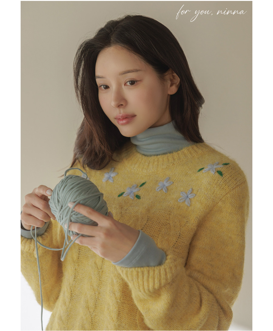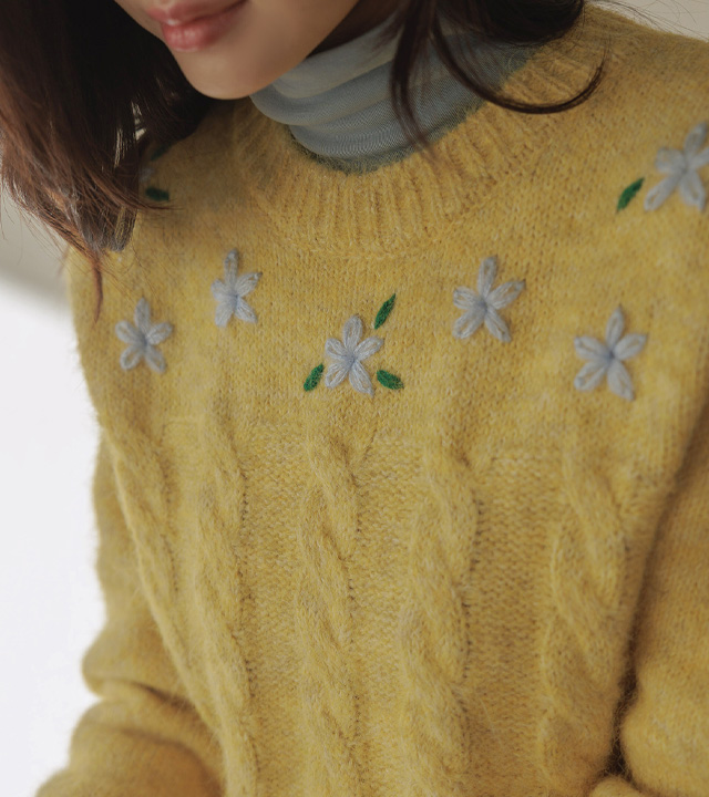 포근한 헤어리 꽈배기 니트에 자수가 은은히 더해져 겨울 내내 사랑스럽게:)
