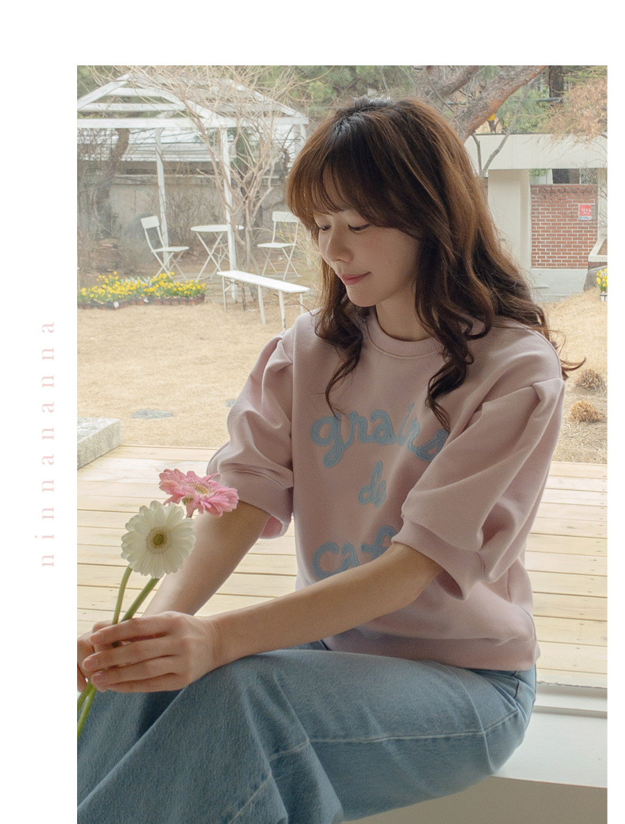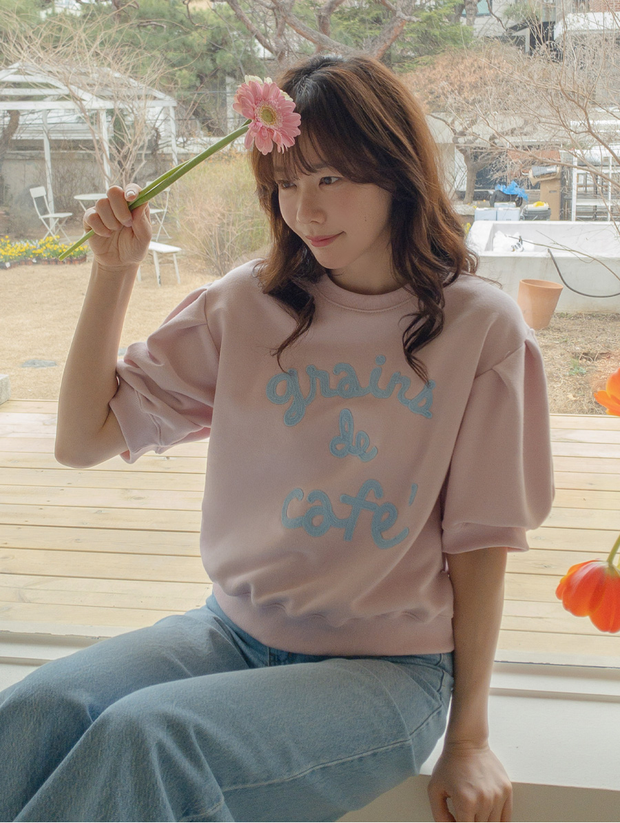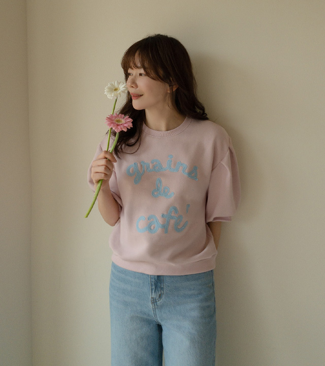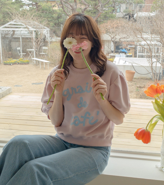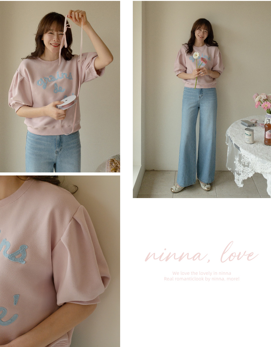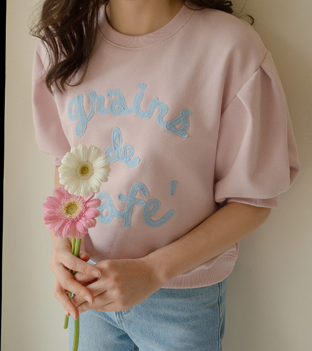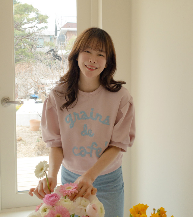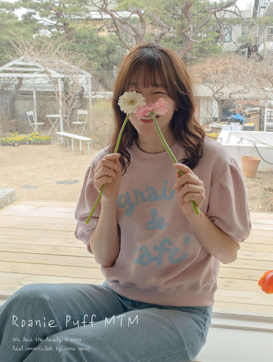 탄탄한 소재와 여유 핏으로 편안하게, 자수 레터링과 퍼프 디테일로 러블리하게 입기 좋은 맨투맨♡