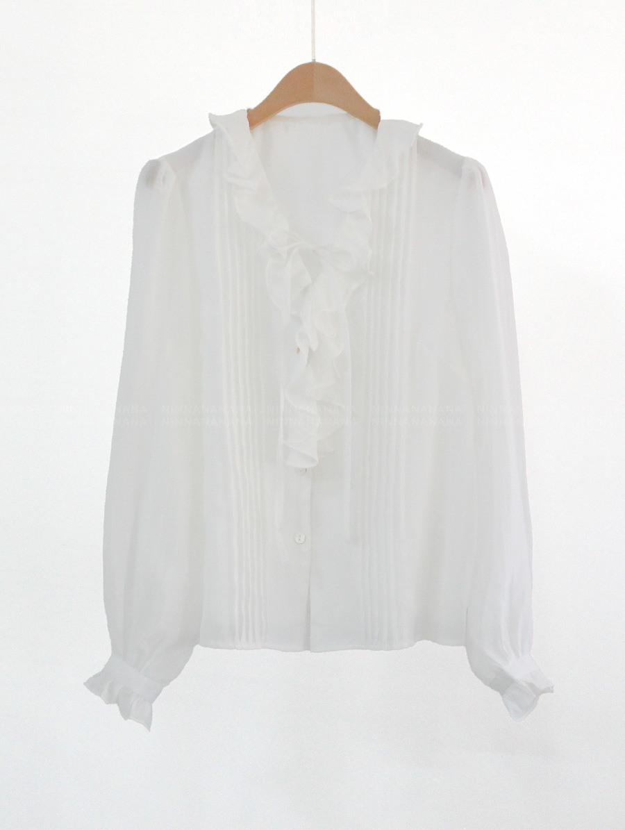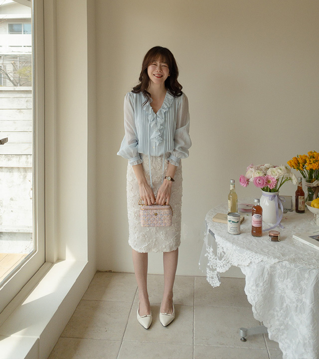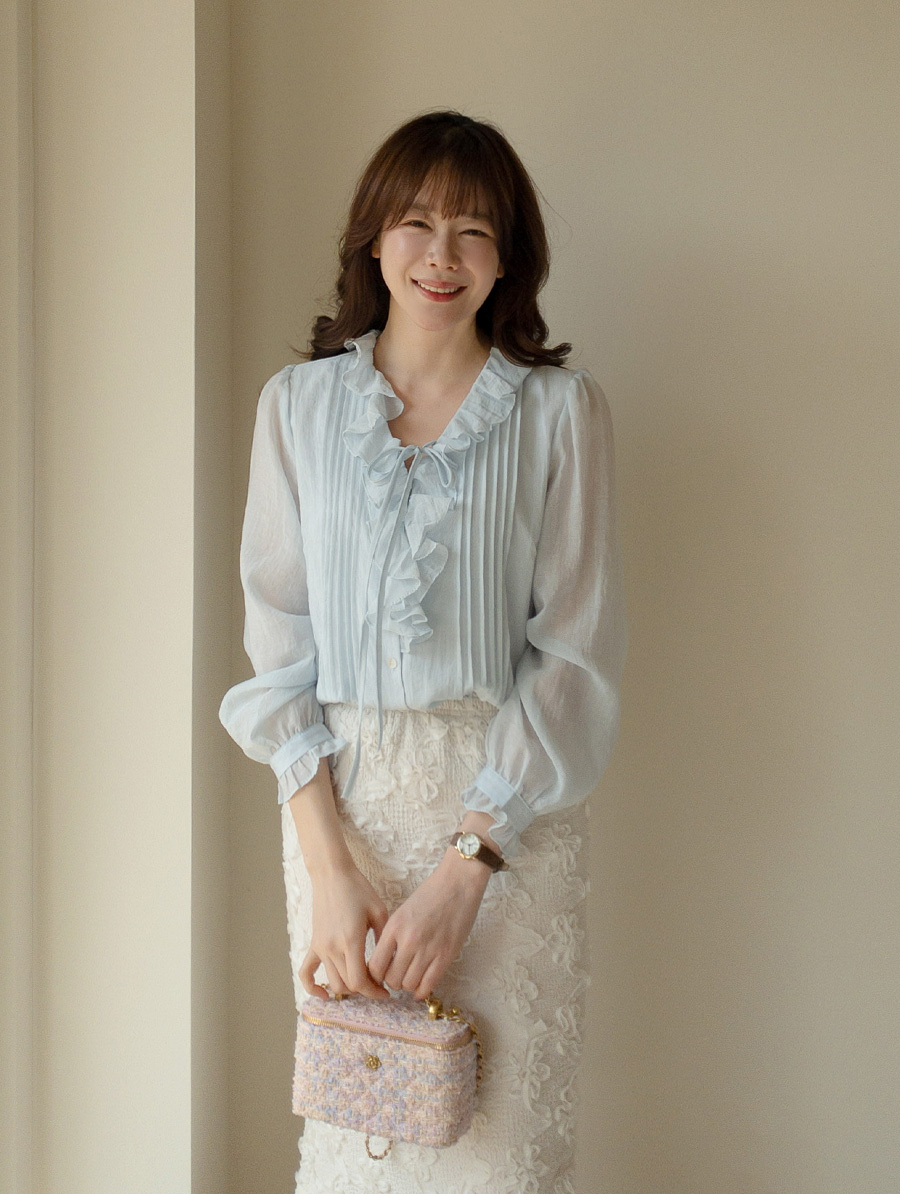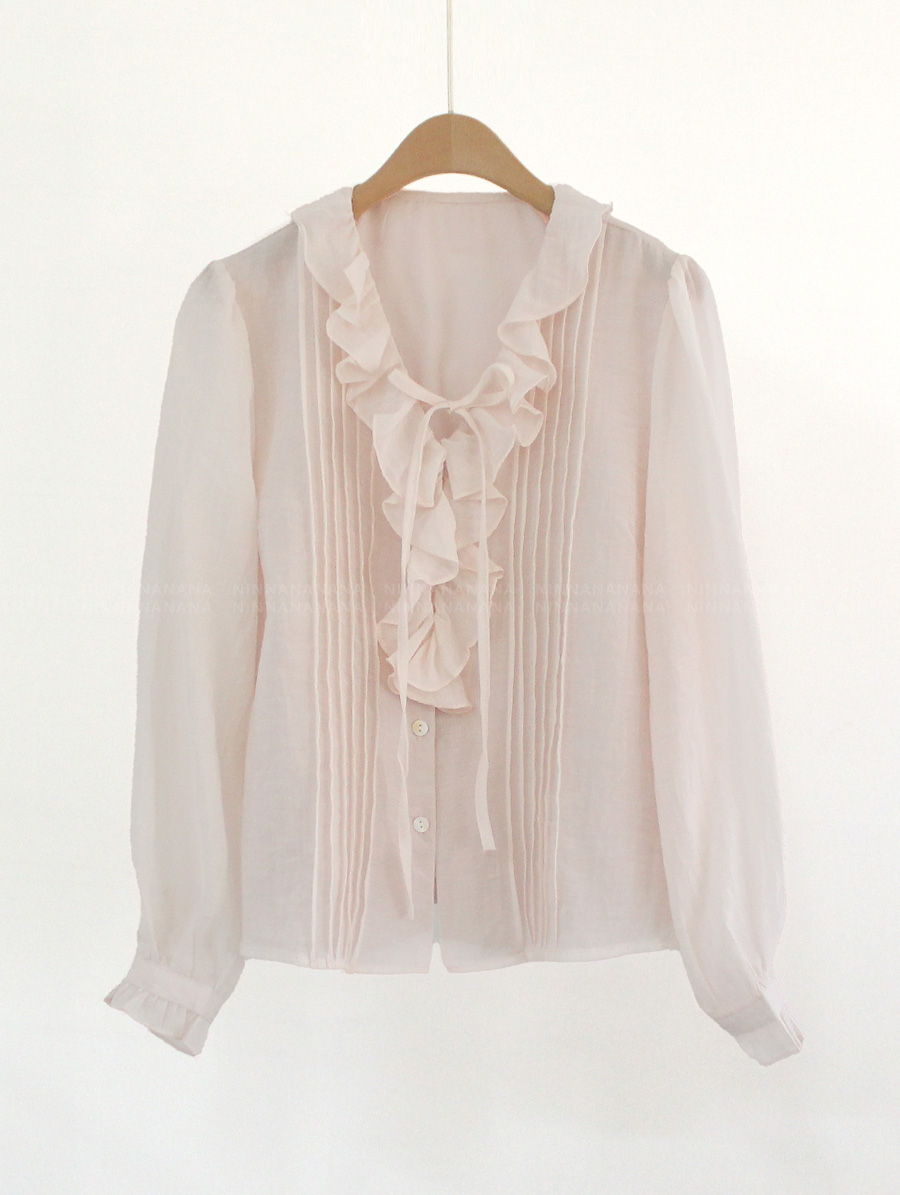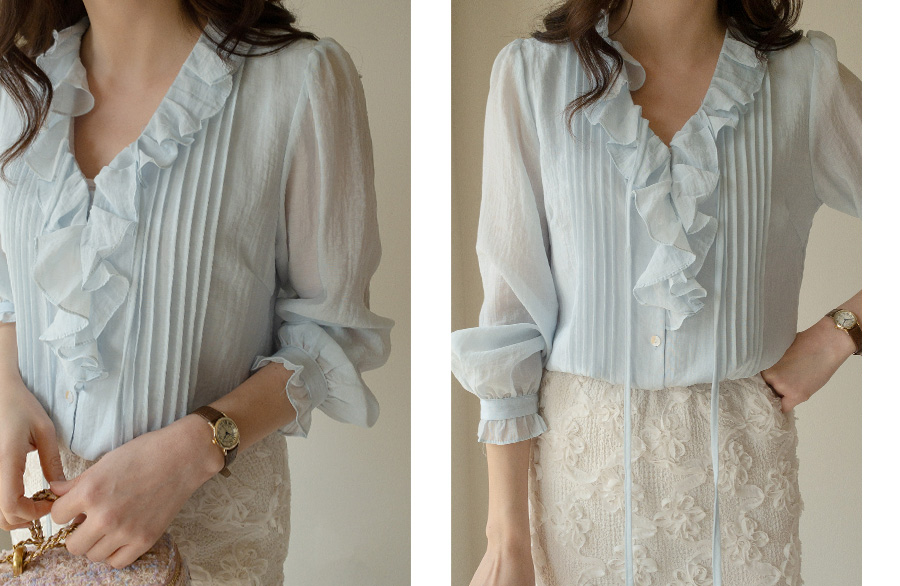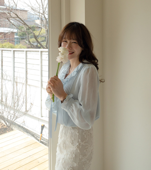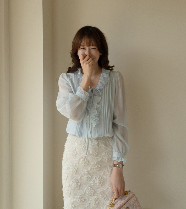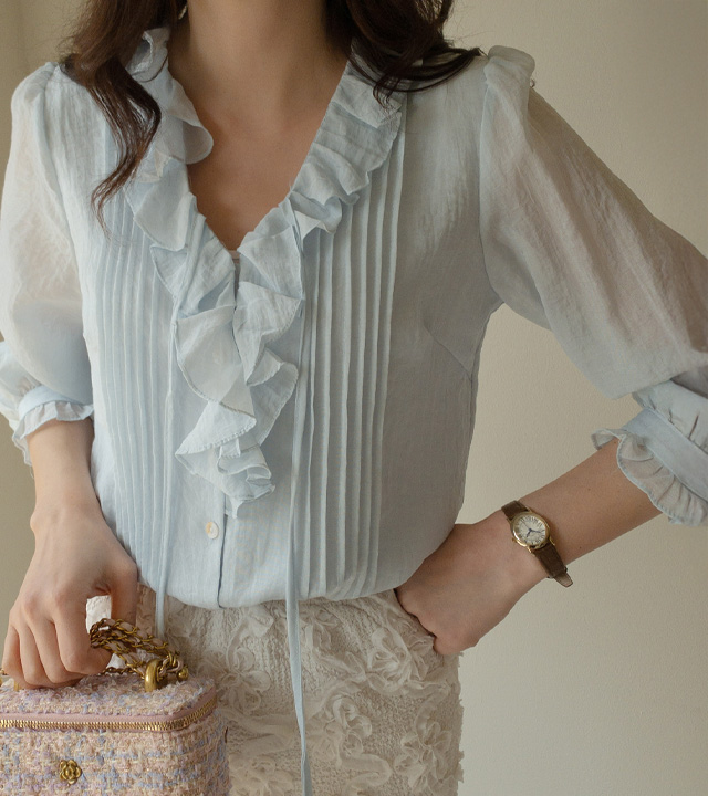 프릴과 핀턱 디테일이 더해져 입는 순간 로맨틱한 분위기가 완성되는 블라우스♡